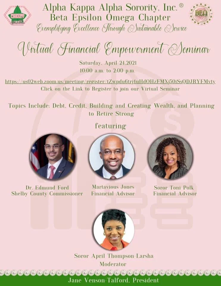 Virtual Financial Empowerment Seminar Saturday, April 24, 2021 10:00 AM 2:00 PM Google Calendar ICS Hear from financial experts on topics of credit, debt, creating wealth, and retirement planning. You’ll receive “a wealth” of information and a chance to win prizes. Join via zoom on the using the link below. This event is open to the public. Zoom Link